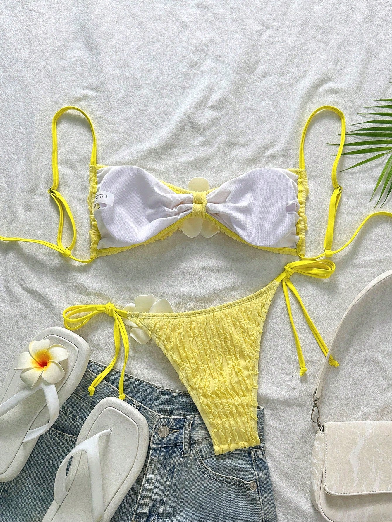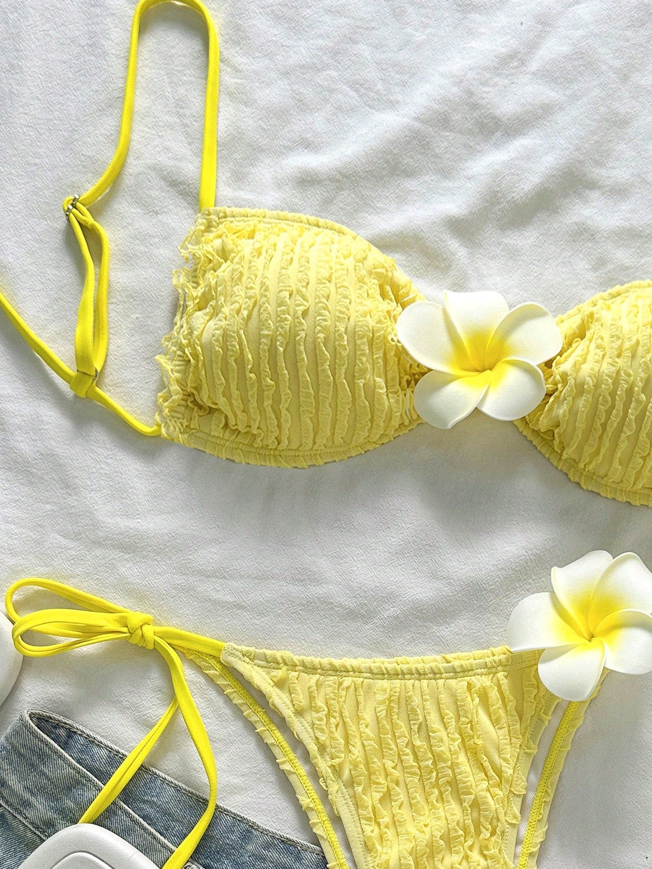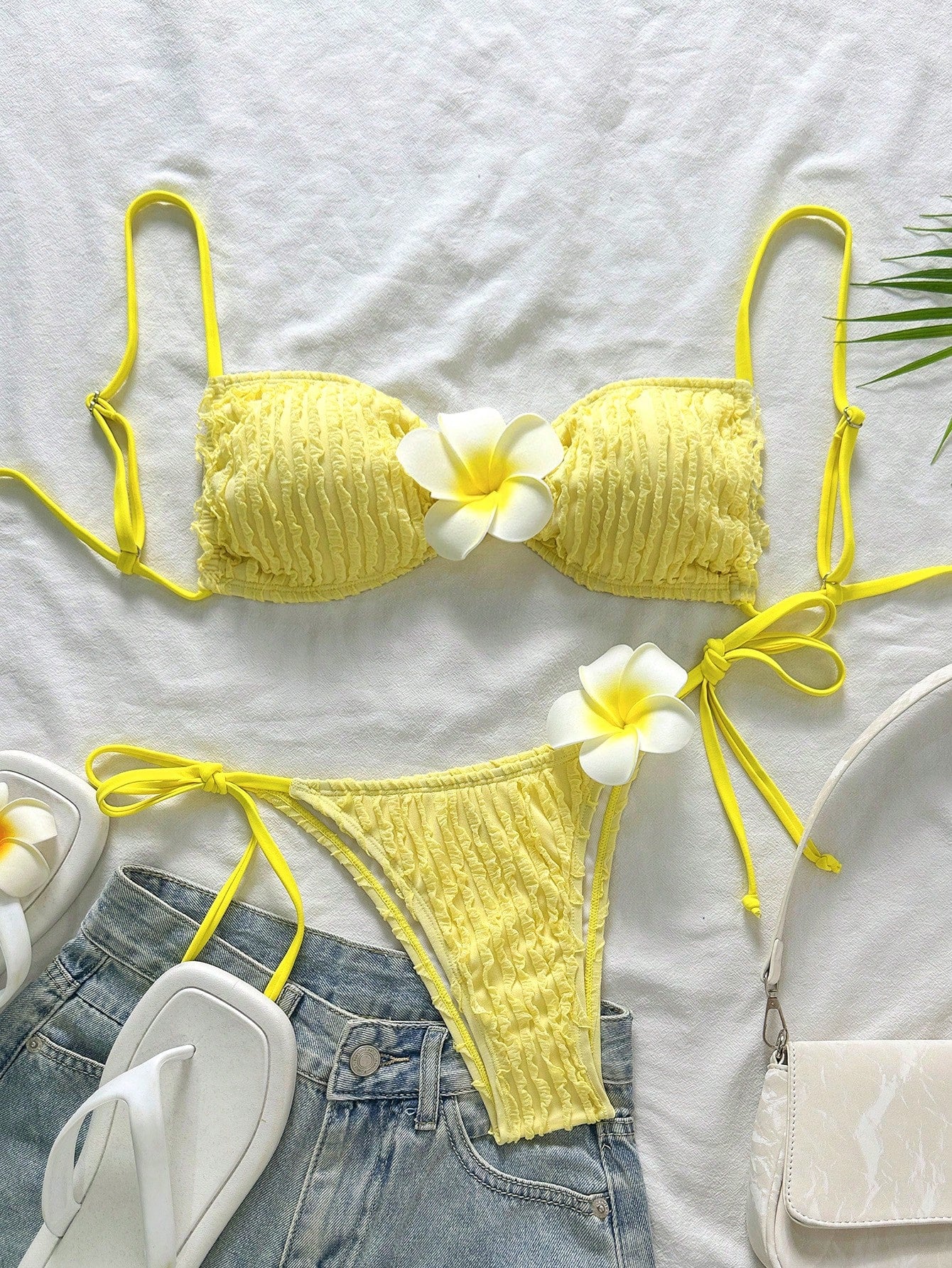 Bikini de dos piezas unicolor con textura de tela y detalles floral