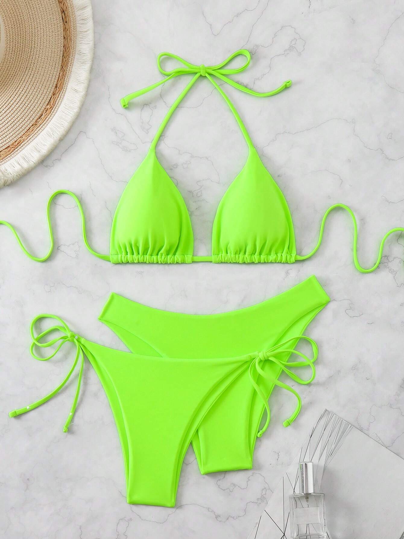 Conjunto de bikini de 3 piezas con top halter de cuello y tirantes