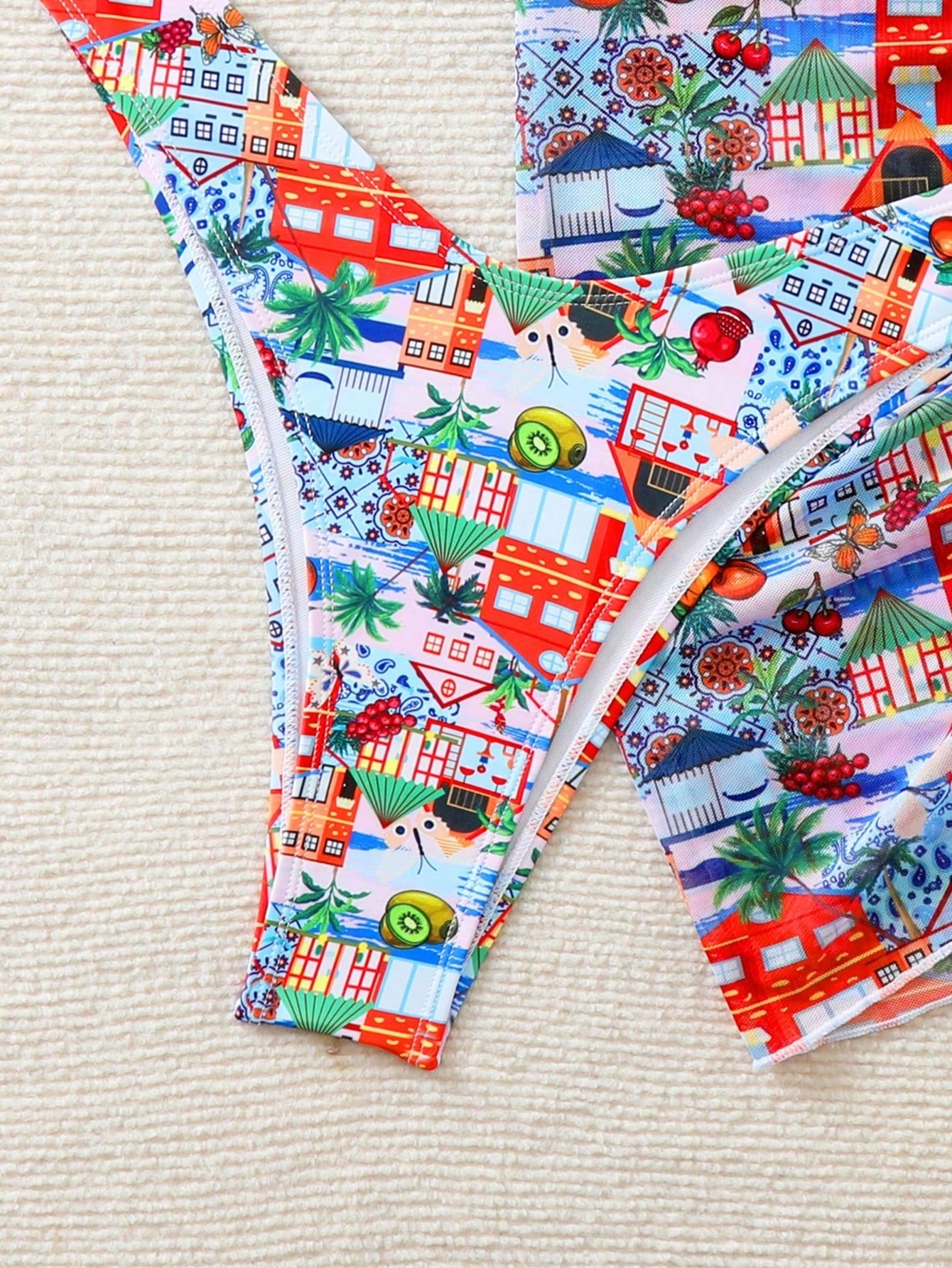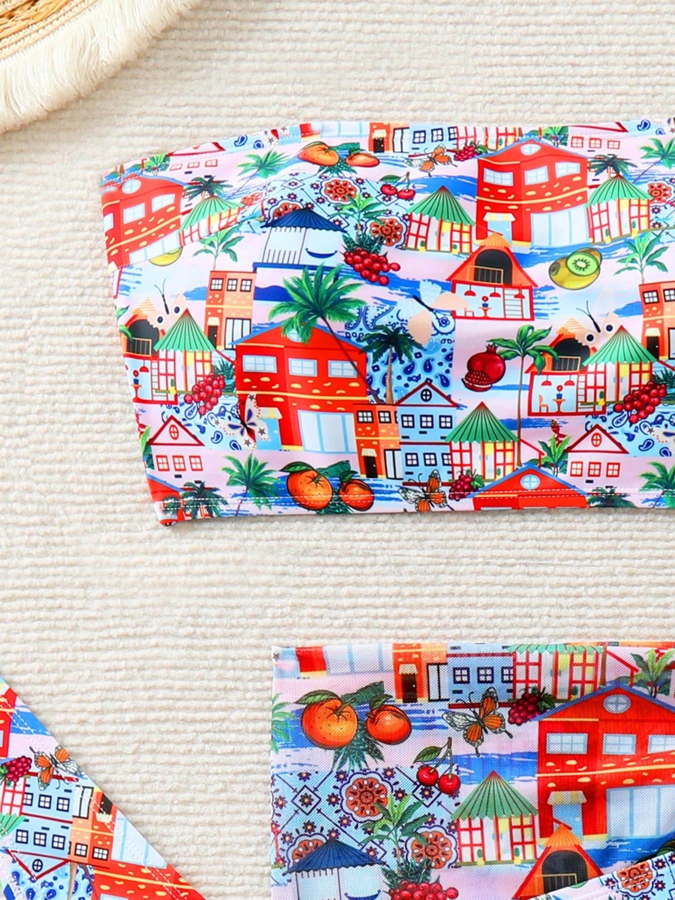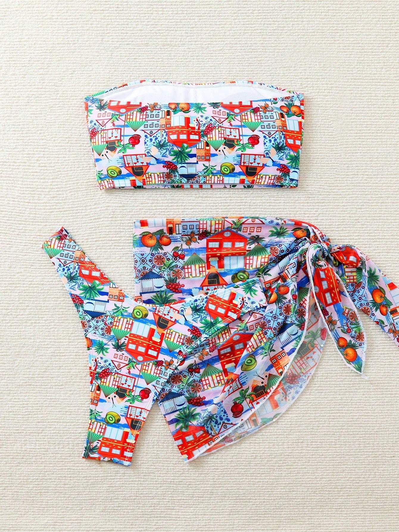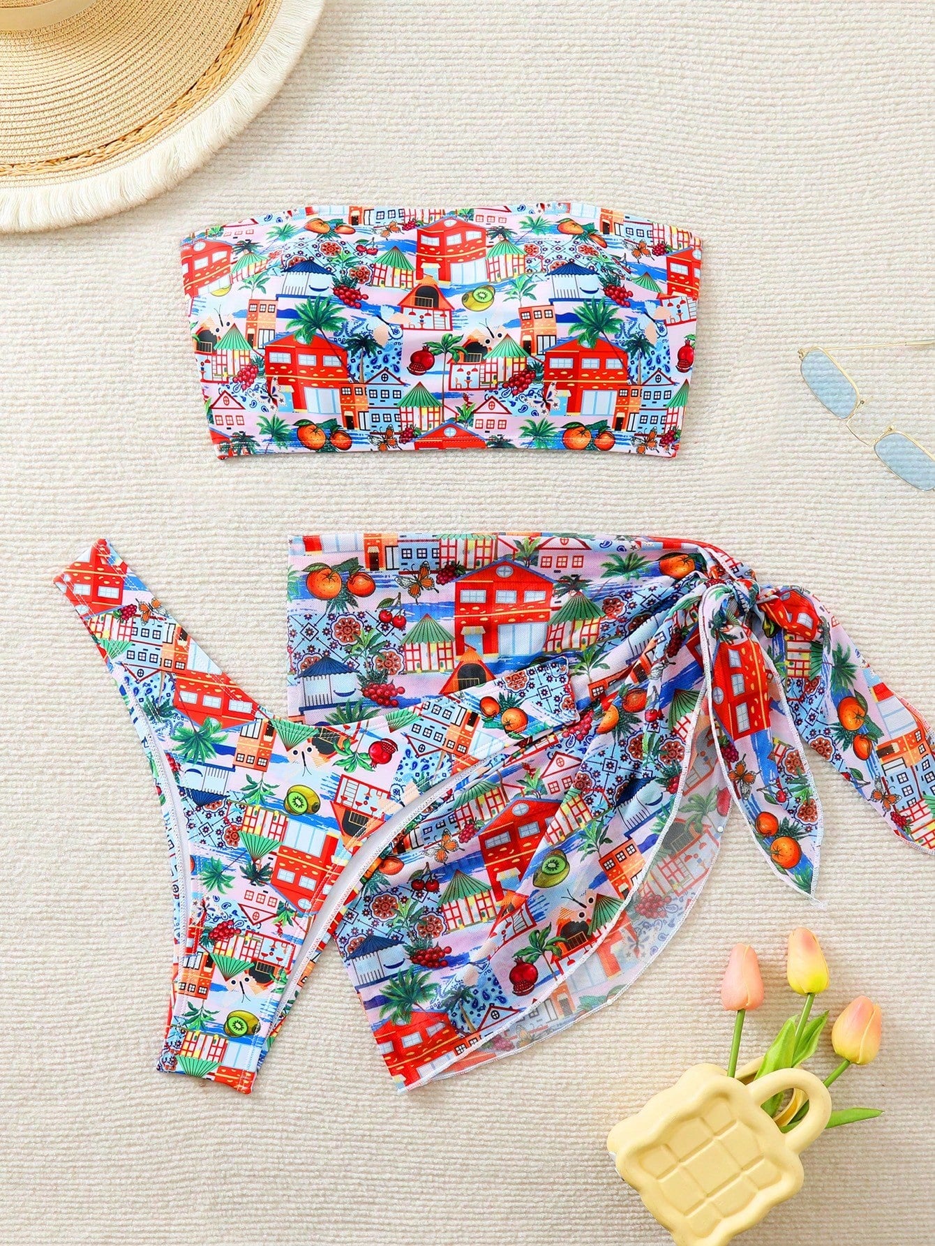Set de bikini de 3 piezas con Top bandeau con estampado tropical de frutas y palmeras, Bottom de bikini de corte alto y falda de malla