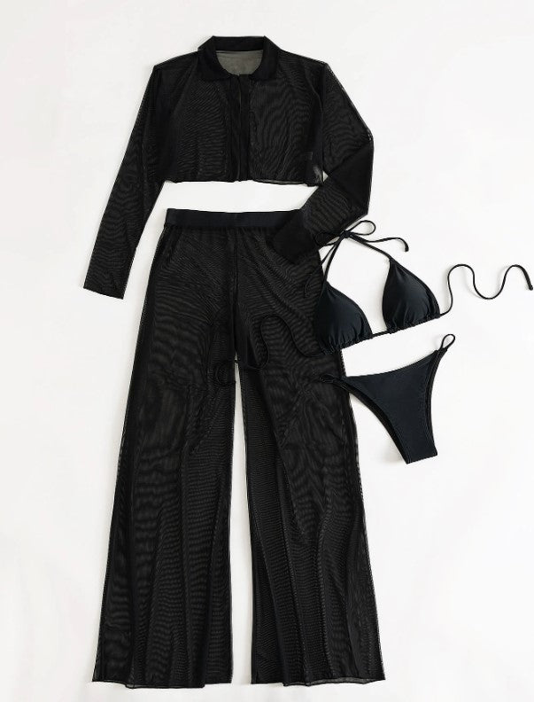 Traje de baño de 4 piezas, incluye bikini de escote con sostén triangular y tanga, camisa transparente y pantalones