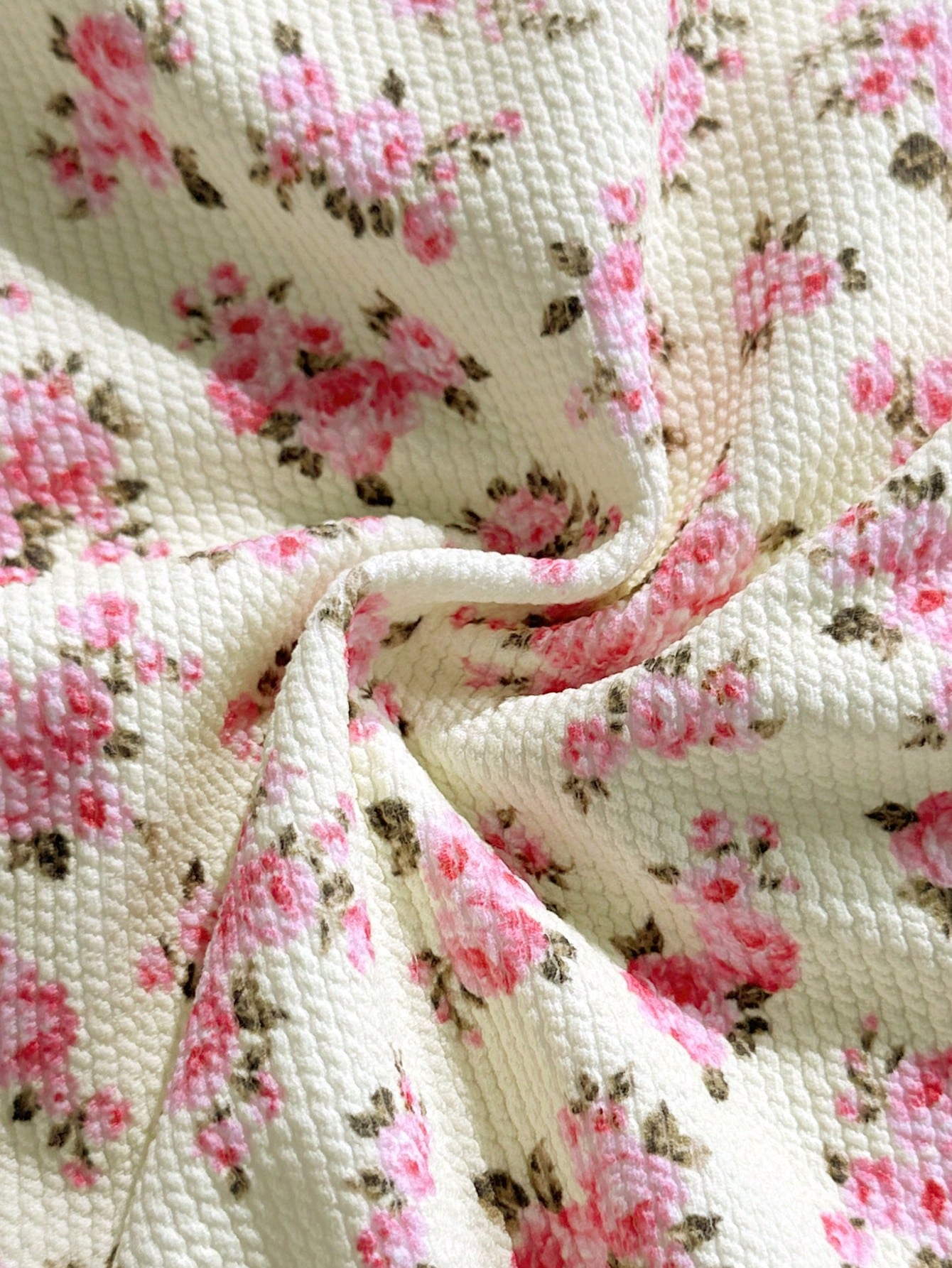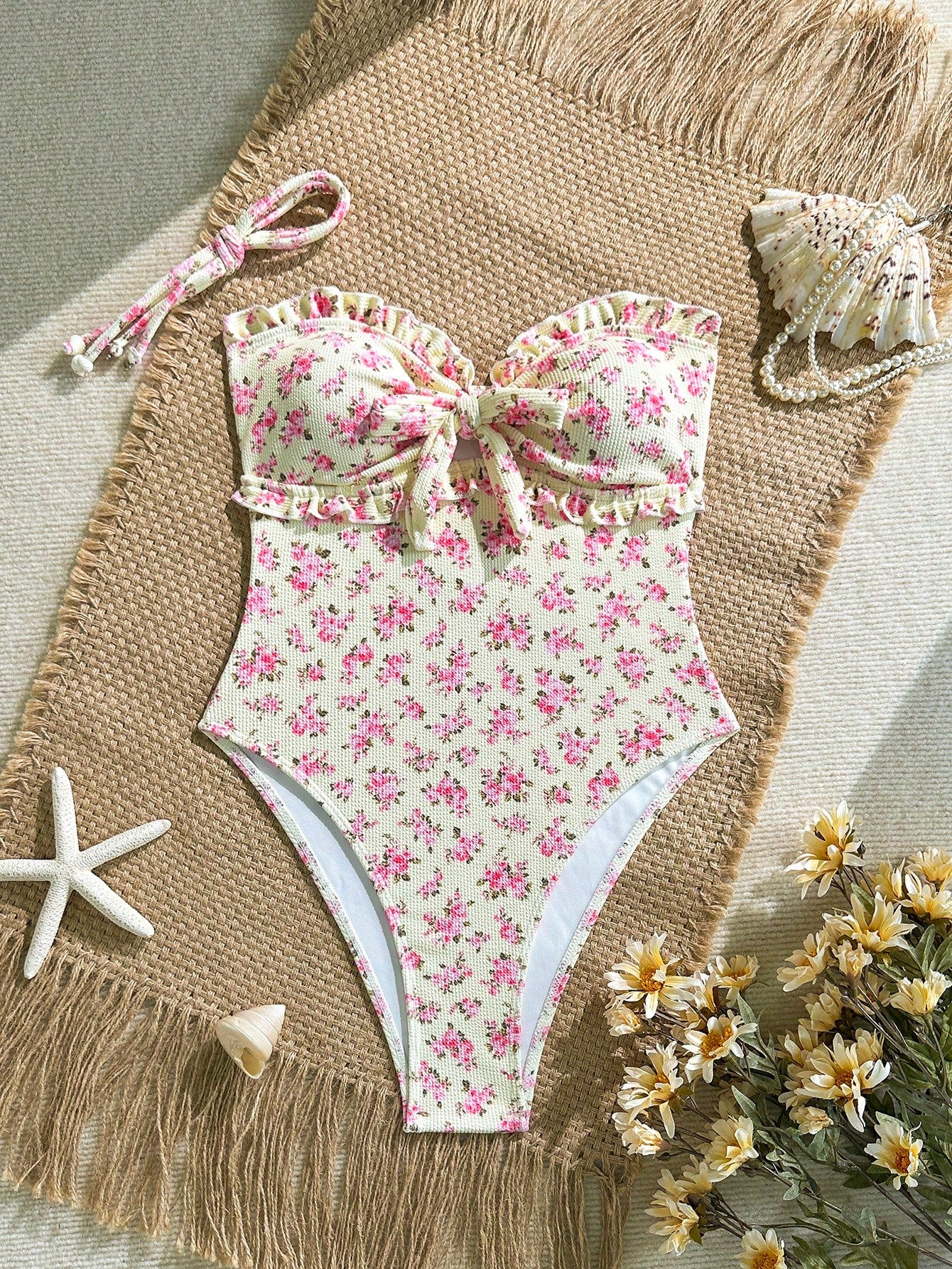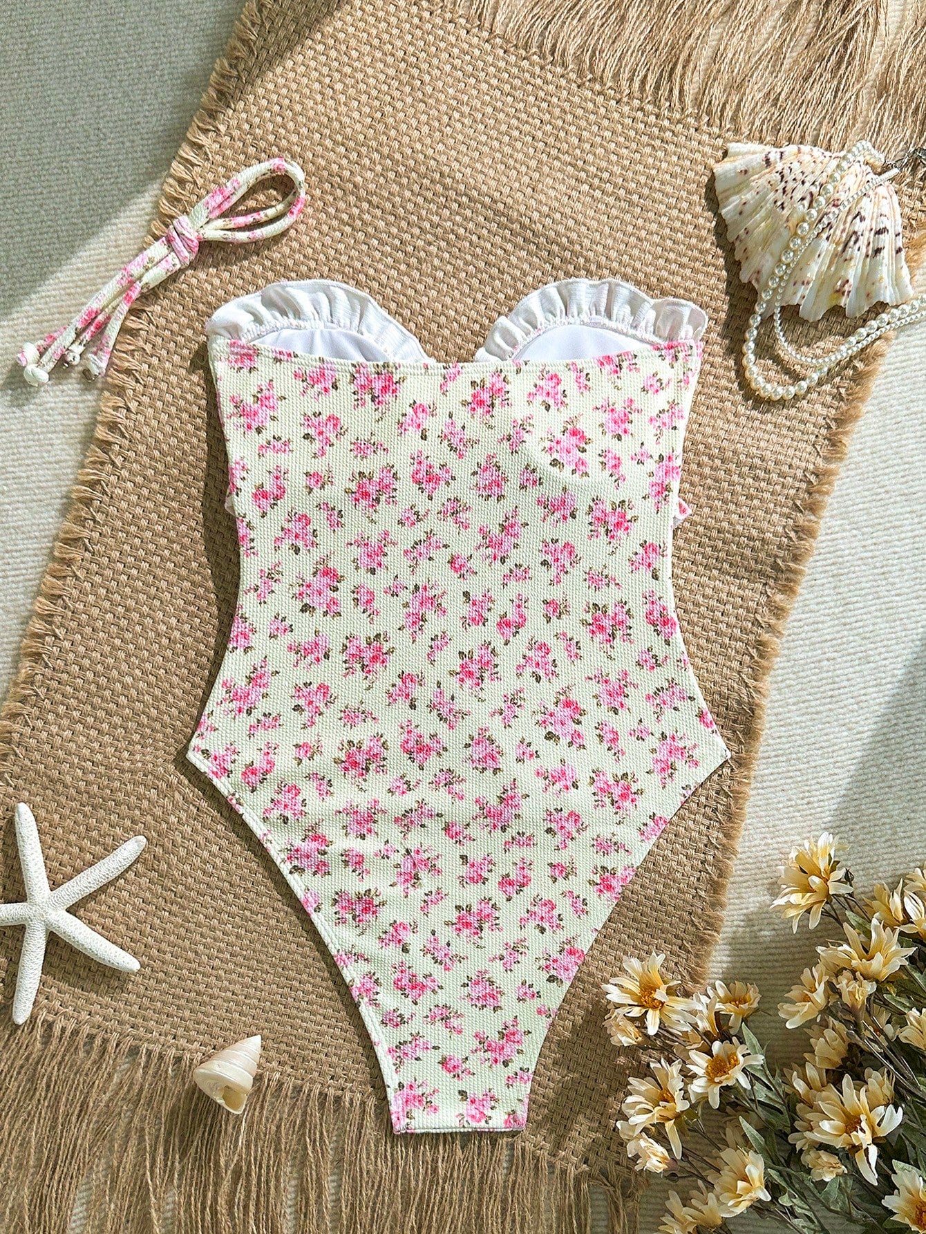 Traje de baño ajustado de una pieza con estampado de tela texturizada y volantes