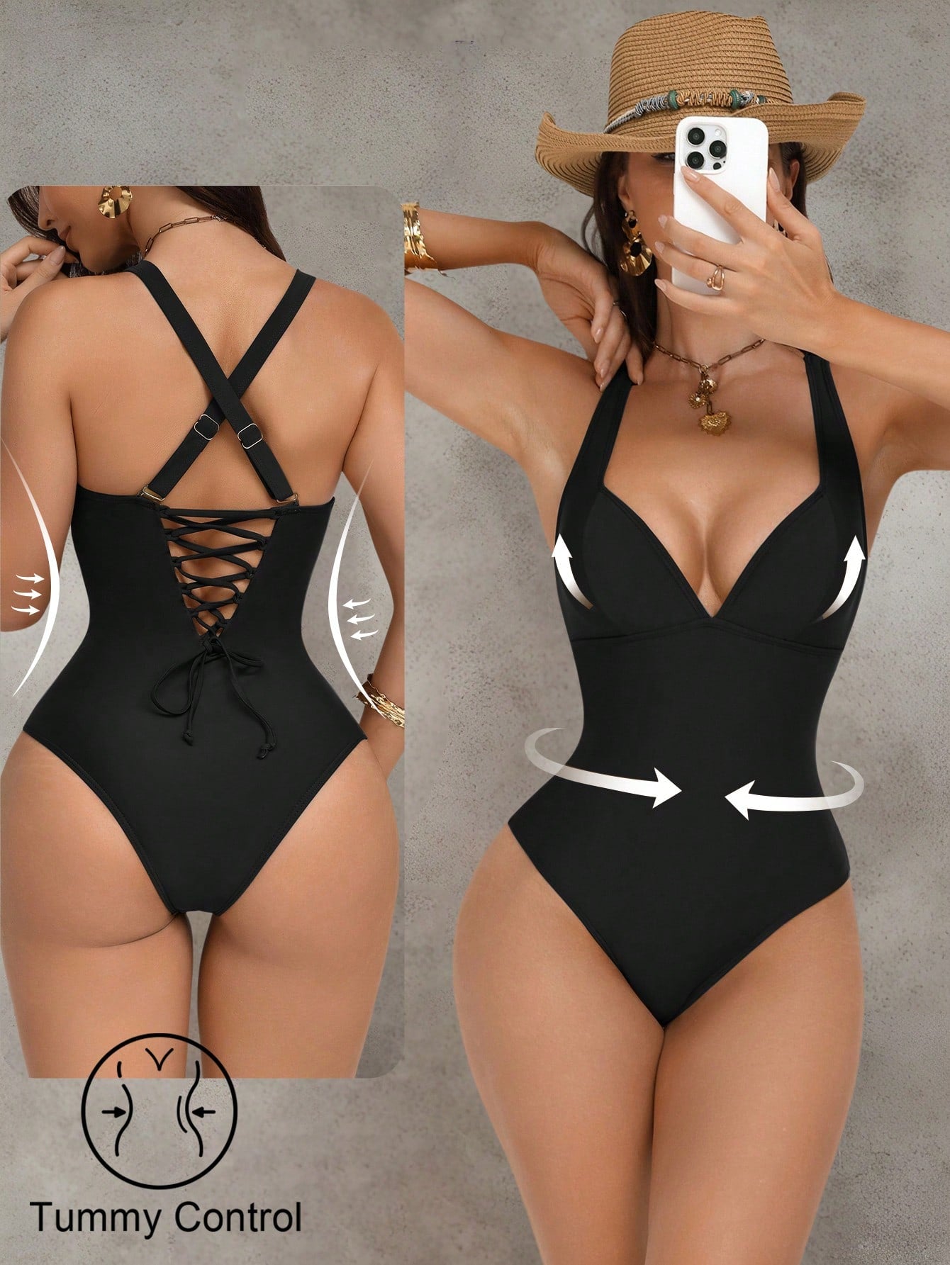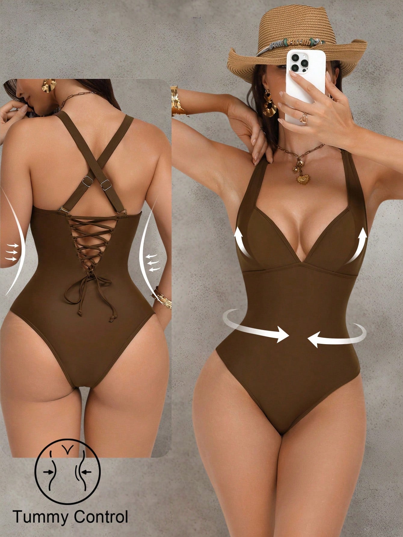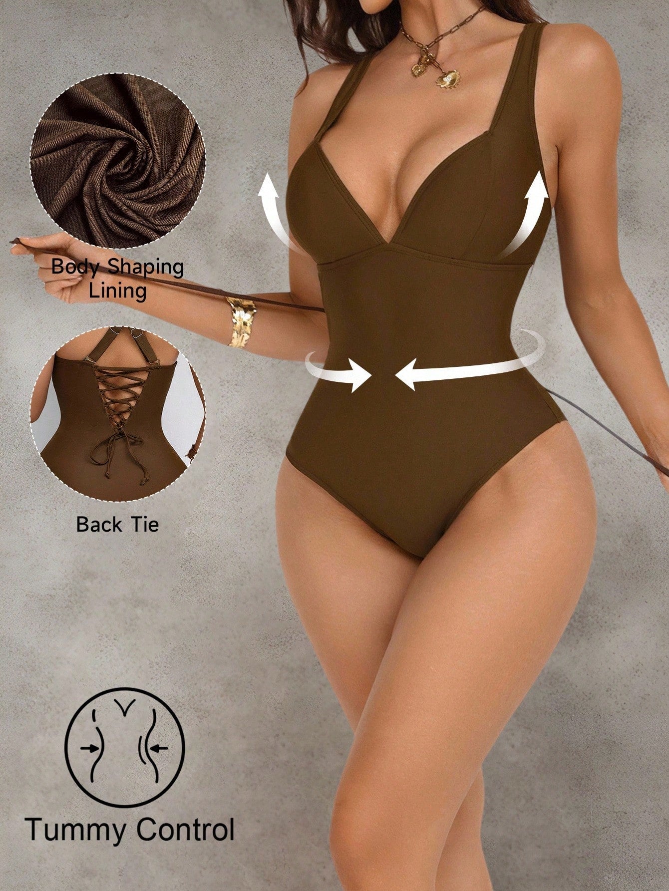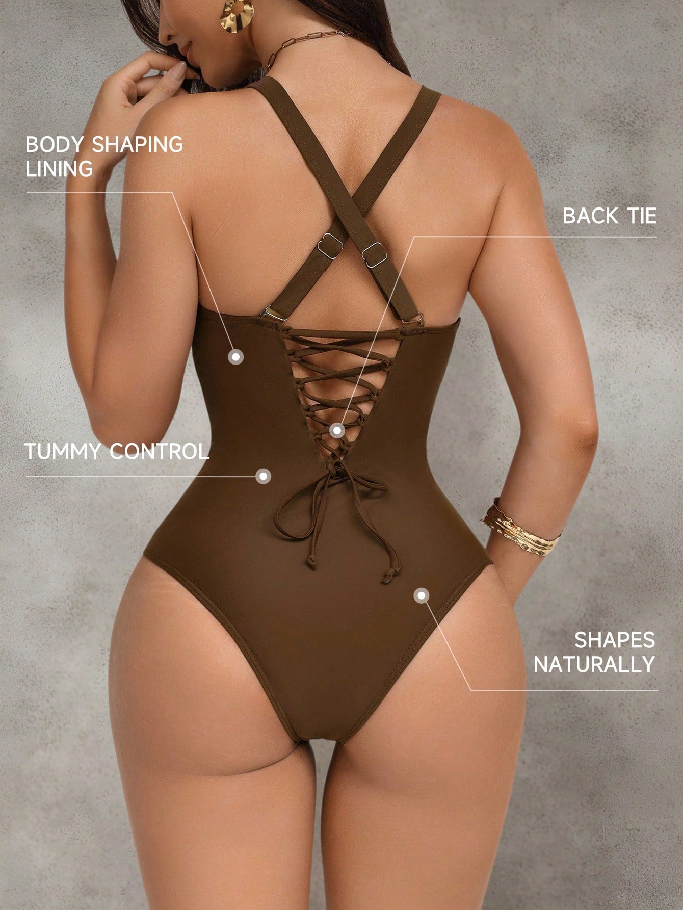 Traje de baño de una pieza con control de abdomen y push-up, con diseño de patchwork marrón, tirantes anudados y espalda descubierta, elegante y sexy para fiestas y piscina