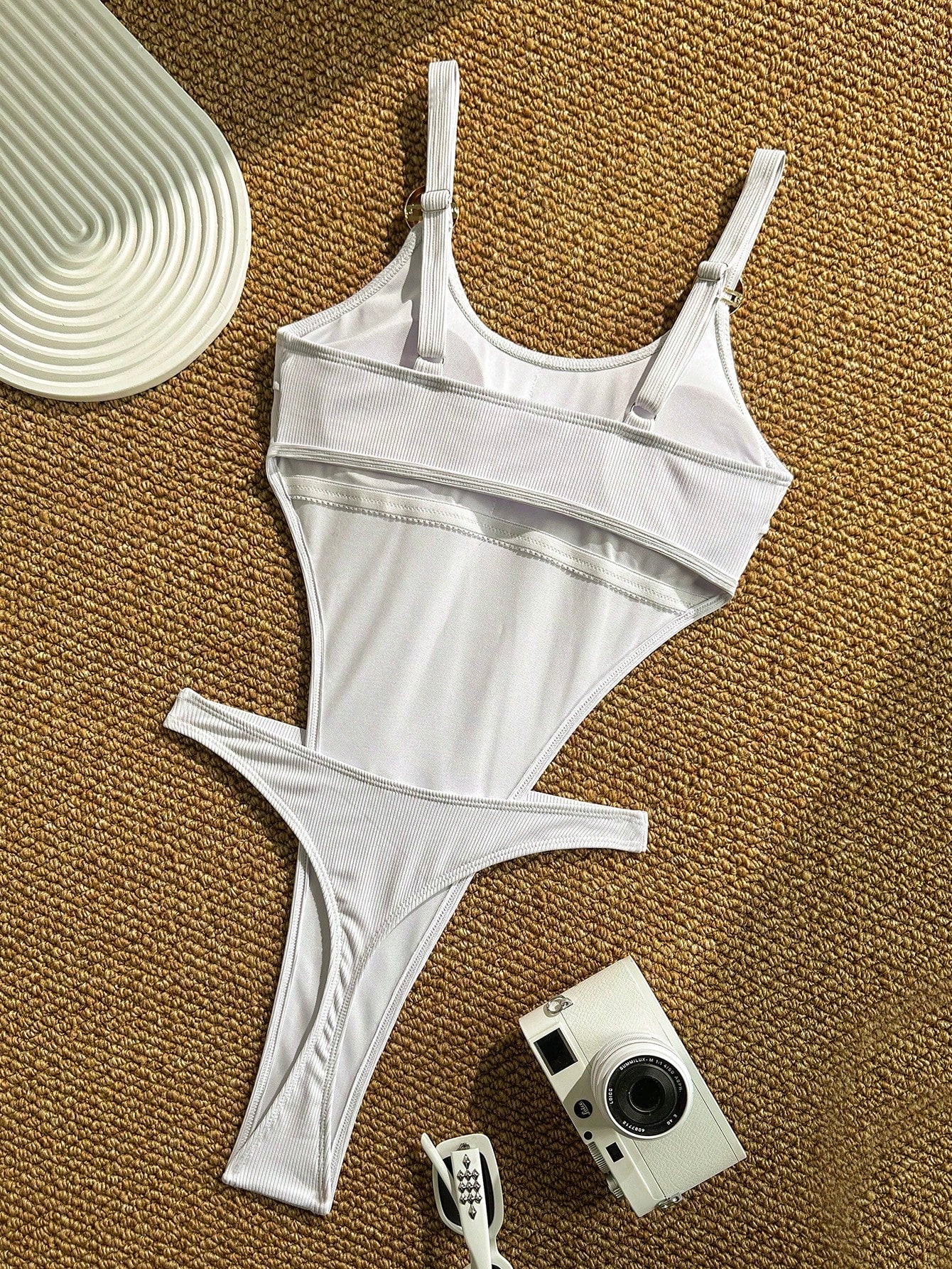 Traje de baño de una pieza de tela texturizada blanca pura y decoración metálica sexy