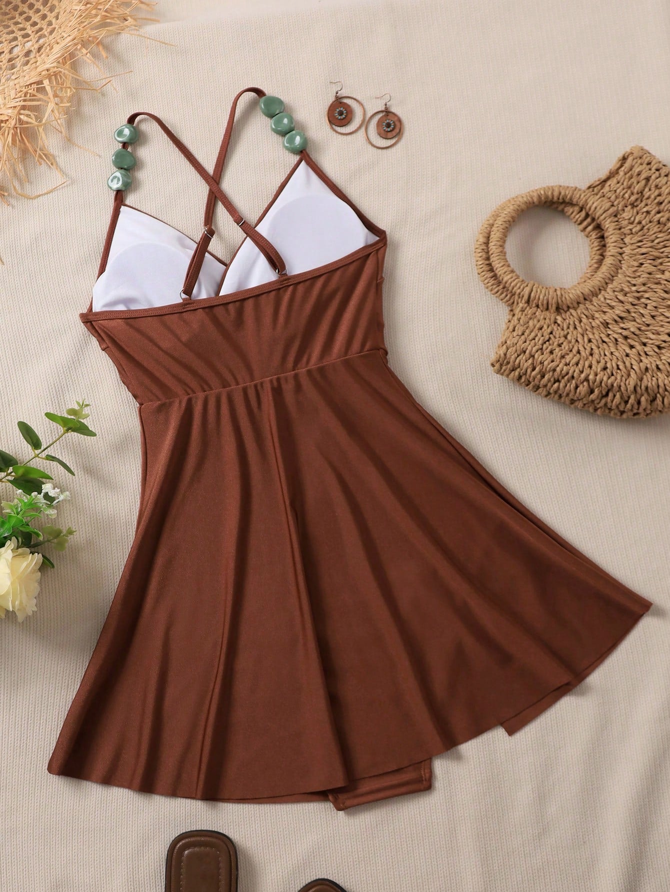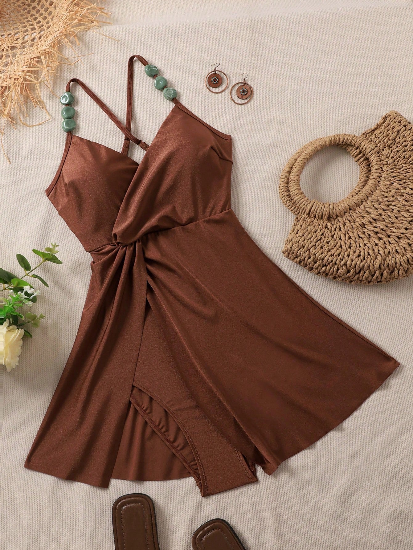 Vestido de baño de una pieza con decoración de abalorios y pliegues cruzados