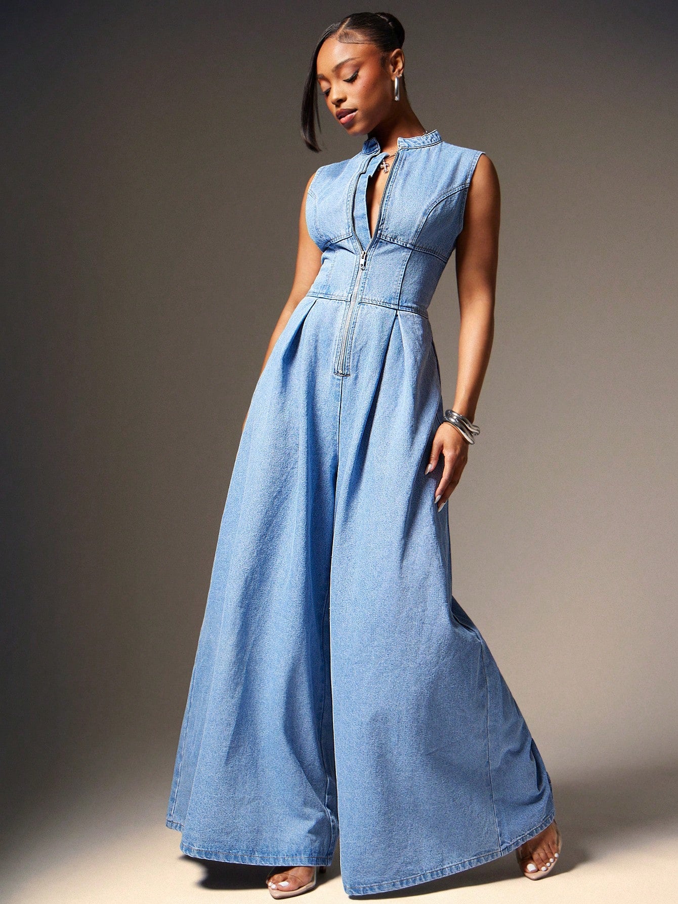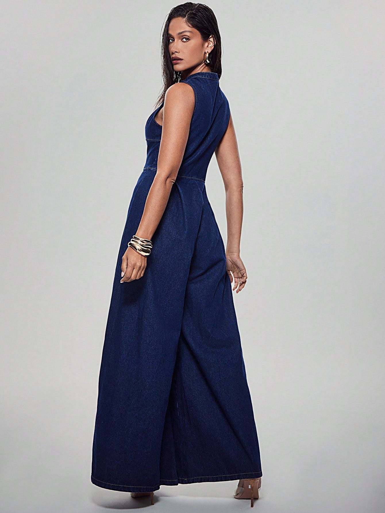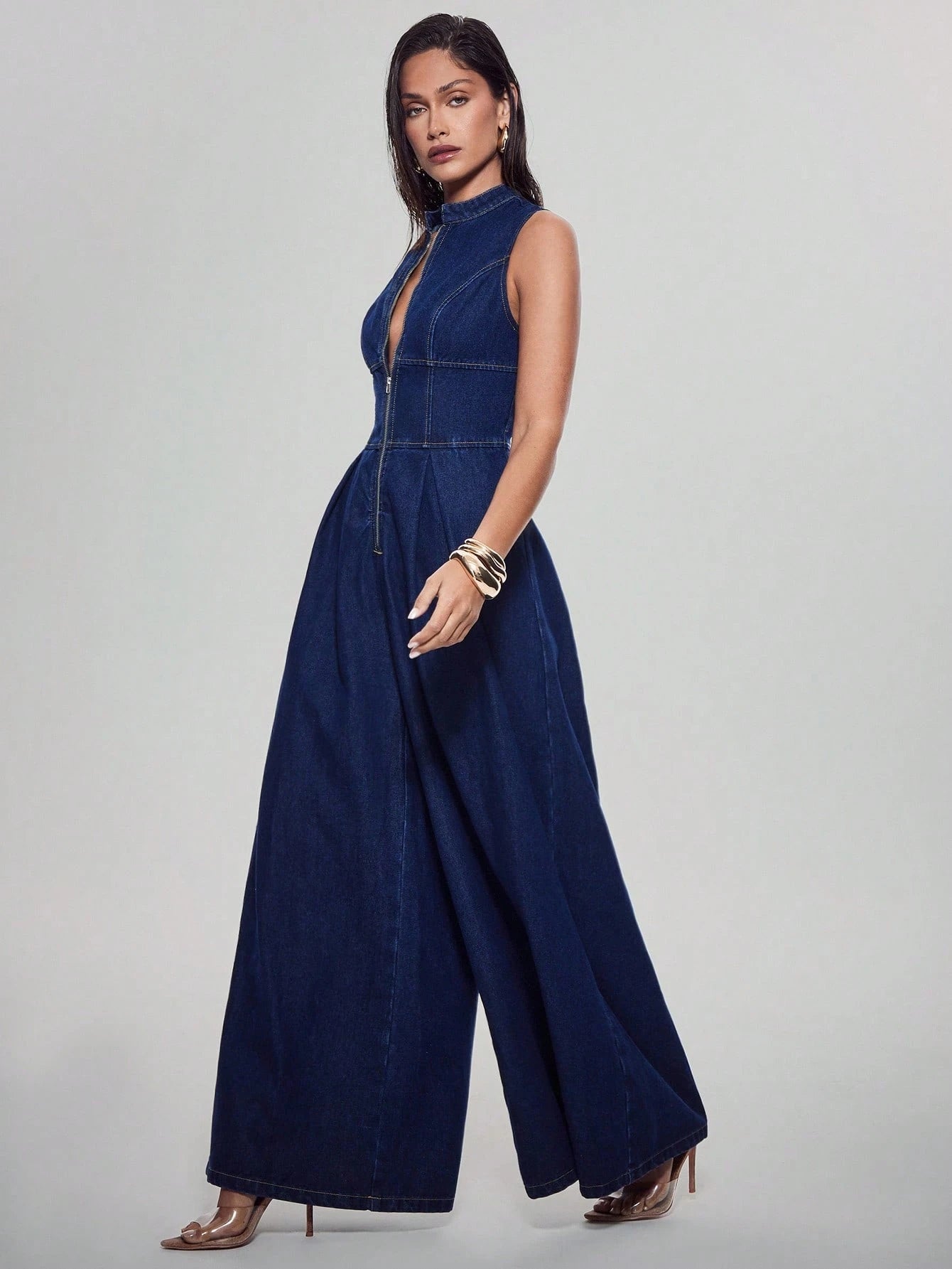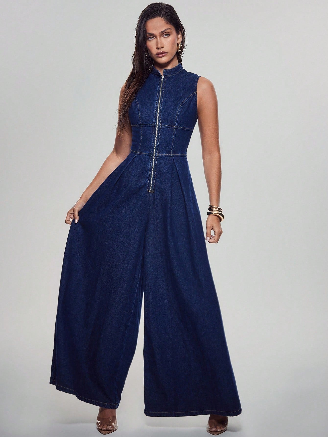 Mono de mezclilla sin mangas con piernas anchas y cremallera delantera